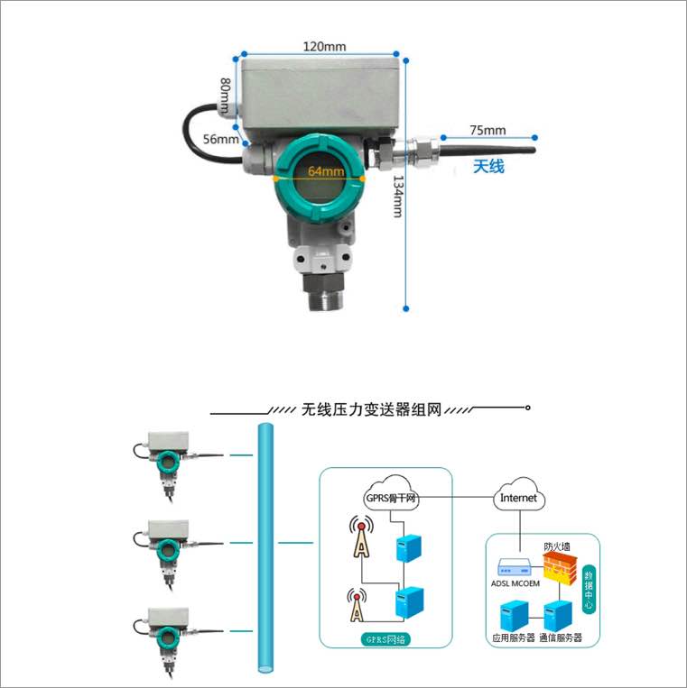 ZYB12XX 是以 GPRS 无线网络为核心,将压力数据进行无线传输的新型工业级变送器产品,支持集成大容量一次性 3.6V 锂电池组或选用外部电源供电;内部集成高可靠性的 GPRS 网络通信模组,压力数据的无线传送,弥补了传统压力变送器只能通过有线方式(RS485/232)进行数据传送的缺点;施工简单,真正做到即装即用,后期维护方便,按周期更换电池即可。